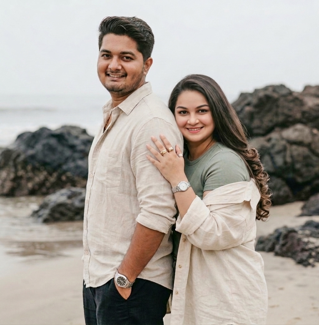 (use our photo as a couple herE and keep our face 100% accurate with every face details which i uploaded, Keep Original Face From Uploaded Photo Exactly, Do Not Alter Facial Features In AnyWay, No Face Changes Even 1% ,Strictly Preserve the Face) Pose & Body: * The Man: Standing upright, positioned in profile facing left. His body is slightly angled away from the camera. His left hand is tucked into his trouser pocket. The Woman: Standing behind the man, leaning her head and shoulder against his back. Her right hand is placed gently on his shoulder, fingers slightly curled. Face & Direction: * The Man: Facing strictly left in profile. LOOKING AT CAMERA with smile. The Woman: Facing the camera directly with a soft SMILE. Her head is tilted slightly as she rests it on the man’s shoulder. Outfits: The Man: An unbuttoned, light oatmeal-colored linen shirt with rolled-up sleeves and black tailored linen trousers, SILVER WATCH The Woman: An olive-drab or sage-green ribbed tshirt WITH half sleeves. She has a large, oversized cream linen button-down shirt draped loosely over her arms with sleeves rolled up, falling off the shoulders. The Woman: Several chunky silver and gold statement rings on her right hand; a thin black cord bracelet on her right wrist. Environment & Composition: Environment: A secluded beach with damp, light-colored sand and large, dark, jagged volcanic rocks scattered in the water. Background: A calm, hazy ocean under an overcast, pale gray sky. The horizon line is soft and diffused. Foreground: The texture of wet sand with faint footprints, creating a sense of depth leading toward the subjects. Lighting & Technicals: HER HAIRS ARE black long VOLUMED CURLS AT ENDS. Lighting: Flat, soft, overcast natural light. There is no direct sun, creating a “low-contrast” but high-detail look. Backlight: Very subtle, cool-toned rim lighting on the hair, caused by the bright, hazy sky. Shadows & Highlights: Soft, gradual shadows. No harsh lines. Color Effect: Muted, desaturated “earthy” palette. Heavily influenced by cool blues, sage greens, creams, and deep blacks. The image has a slight matte finish with lifted blacks and a subtle vintage film aesthetic (reminiscent of Fujifilm 400H). Camera Click Angle: Eye-level medium shot. Lenses: 50mm prime lens to create a shallow depth of field, keeping the couple sharp while the distant rocks and ocean have a soft, creamy bokeh. (both smiling on camera). (Note:Man have muscular arms) both’s faces are bright. she has black hairs.