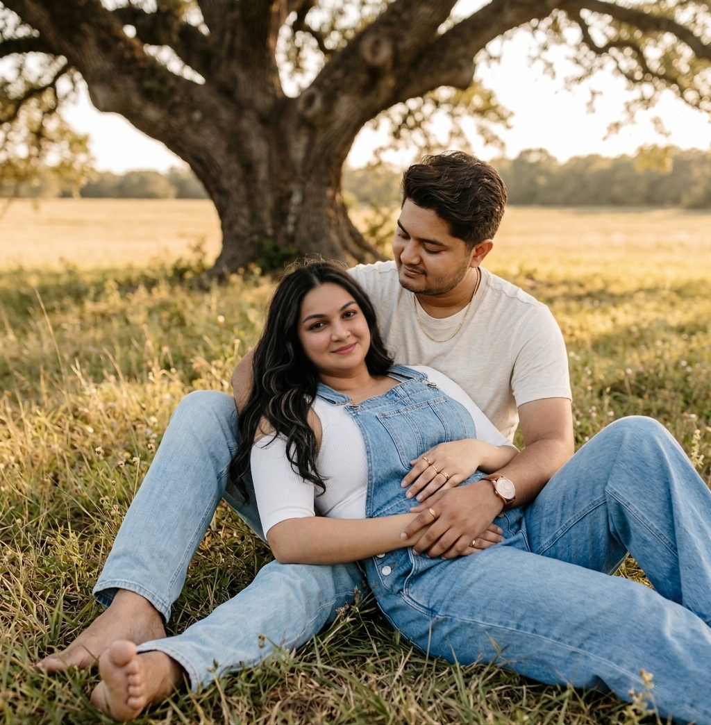(use our photo as a couple here and keep our face 100% accurate with every face details which i uploaded, Keep Original Face From Uploaded Photo Exactly, Do Not Alter Facial Features In AnyWay, No Face Changes Even 1% ,Strictly Preserve the Face) Core Subject & Pose: A young couple is in a close, intimate, reclining embrace, lying on the ground in a grassy field. The Man: He is reclined slightly back. His torso is positioned behind the woman, supporting her. Body & Legs: His legs are sprawled loosely behind the woman, partially visible in light-wash jeans. Arms & Hands: His left arm is wrapped securely around her back, with his left hand resting on her side, near her waist, holding her hand. His right arm is relaxed on his own right leg. Face & Direction: He is looking down at the woman with a gentle, loving gaze. The Woman: She is reclining between his legs, nestled back against him. Body & Legs: Her legs are the most prominent element in the foreground. They are bent at the knee and crossed at the ankles, pointing towards the bottom left. Her torso is leaning back against the man. Arms & Hands: Her right arm is bent, and her right hand is resting gently on her own chest/midsection. Her left hand is intertwined with the man’s left hand. Her right hand (holding the man’s) shows a clean, pale manicured nail. Face & Direction: She is looking up at the camera,, with a peaceful, adoring smile. Hair: Her long, wavy, brunette hair (with highlights) cascades over her left shoulder, framing her face. Detailed Attire: The Man: Shirt: A simple, relaxed-fit, plain, heather-cream crewneck t-shirt. Bottoms: Mid-to-light wash denim jeans. The Woman: Top: A simple white ribbed tank top with full sleeves upto elbow. Main Outfit: A classic light-wash blue denim bib-overall (jumpsuit), buttoned at the waist. Legs: Wide-leg denim (part of the overall) is prominent in the foreground. Accessories: The Man: A classic brown leather strap wristwatch on his left wrist. A simple, thin gold chain necklace (visible near his neck). The Woman: Multiple simple gold rings are on her fingers (right and left hand). Environment: Setting: A rural, grassy meadow or pasture during golden hour. Foreground: Textured dry and green grass, interwoven with small white wildflowers (like fleabane or aster), fills the immediate foreground and surrounds the subjects’ legs and feet. Midground: The couple, resting on the grass. Background: A very large, mature live oak tree with a massive, twisted trunk and sprawling branches (typical of Texas or Florida) is the central feature, slightly out of focus. Beyond the tree is a sun-drenched, open grassy field (golden/tan colors) stretching to a treeline. Lighting, Camera & Mood: Lighting: Natural, soft, golden hour (warm) light is the dominant source. The light is soft and diffused but has a directional quality (side-front left). Backlight: The open field behind them is bathed in a soft golden glow (backlit feel), creating a natural rim light on their hair. Highlights: Soft highlights on the folds of the denim, the woman’s hair, and the top surfaces of their faces. Shadows: Deep, natural, soft shadows define the curves of their embrace, the texture of the oak tree trunk, and the folds of their clothing. Skin Texture: Natural, soft skin with high resolution, showing minimal pore detail but distinct skin tones. Color Effect: A warm, desaturated, filmic preset with lifted blacks and soft contrast, reminiscent of analog film. The blues are muted, the greens are earthy, and the golds are soft. Camera Click Angle: A low-angle, eye-level medium shot, making the couple’s legs and the grass in the foreground feel prominent. Footwear: Crucially, the man’s right foot (partially visible in the very bottom left corner) is bare, showing a natural, calloused, nude human foot resting in the grass. This indicates they are barefoot.