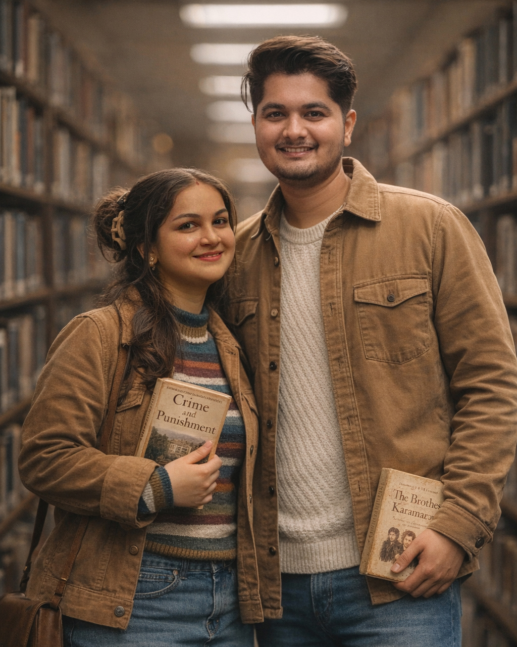 (use our photo as a couple her and keep our face 100% accurate with every face details which i uploaded, Keep Original Face From Uploaded Photo Exactly, Do Not Alter Facial Features In AnyWay, No Face Changes Even 1% ,Strictly Preserve the Face) A cinematic medium-shot of a young man and woman standing close together in a library aisle. The woman on the left is angled slightly toward the man, holding a copy of “Crime and Punishment” against her chest with both hands; her face is in profile, looking up at him with a soft, admiring smile. The man on the right stands with one hand in his pocket and the other holding “The Brothers Karamazov” at his side; he is looking down at her with a gentle, smirk-like expression. Their bodies are angled inward toward each other in a relaxed, intimate “V” shape. Outfits & Accessories Woman: A vintage multi-colored horizontal striped turtleneck sweater in muted earth tones (teal, maroon, mustard), layered under a tan corduroy jacket. She wears a faded blue denim mini-skirt. Her hair is in a messy brunette bun secured with a beige claw clip and soft curtain bangs. Man: A cream-colored textured knit sweater layered under a heavy tan cotton-twill work shirt or light jacket. He wears classic-fit medium-wash blue jeans. Footwear: Not visible in frame, but implied to be leather loafers or vintage sneakers. Environment & Background The setting is a classic university library with rows of tall wooden bookshelves stretching into the distance. The background is a deep-perspective aisle with books in soft bokeh. The foreground is clear, focusing on the couple. The ceiling has recessed fluorescent office-style lights that provide a soft, overhead ambient glow. Lighting & Color Effect Lighting: Soft, diffused indoor lighting with a slight top-down orientation. No harsh direct light. Backlight: Very subtle rim lighting on their hair and shoulders to separate them from the dark bookshelves. Color Grading: A warm, desaturated 90s film aesthetic with heavy brown and tan undertones. The greens and blues are muted. Shadows & Highlights: Low-contrast shadows that are slightly “lifted” or “crushed” (giving a matte look). Highlights are soft and creamy, especially on the faces. Technical Camera Specs Camera Angle: Eye-level, straight-on medium shot. Skin Texture: Hyper-realistic, showing natural pores and soft skin details without digital over-smoothing. Film Grain: Fine analog film grain throughout to enhance the vintage, nostalgic mood. Lens: 35mm or 50mm lens effect with a shallow depth of field ($f/2.8$) to blur the background library shelves. both looking at camera with smile.
