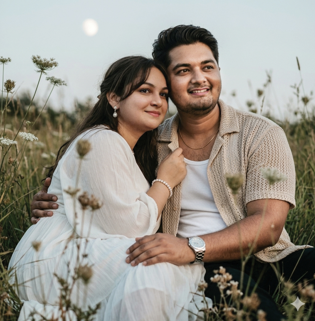 (use our photo as a couple her and keep our face 100% accurate with every face details which i uploaded, Keep Original Face From Uploaded Photo Exactly, Do Not Alter Facial Features In AnyWay, No Face Changes Even 1% ,Strictly Preserve the Face) A romantic, intimate portrait of a couple nestled in a field of tall wild grass. The man is seated, leaning back slightly, with his right arm draped protectively around the woman’s waist. The woman leans into him, her left hand gently grasping the collar of his shirt near his chest. Both are looking toward the same off-camera point (camera right) with soft, serene, and hopeful expressions. Their bodies are closely intertwined, creating a sense of warmth and connection. Outfits & Accessories Woman: Wearing a flowing, long-sleeved white bohemian dress . Her hair is Curtain Bangs & Wispy Layers. She wears a delicate pearl bracelet and small teardrop earrings. Man: Dressed in a relaxed, open-knit beige or cream button-down shirt over a white ribbed tank top. He wears a thin gold chain necklace and a silver wristwatch with a metal link band. big muscular arms. Footwear: Not visible Environment & Composition Environment: A lush, overgrown meadow during the “Blue Hour” or early twilight. Foreground: Out-of-focus tall, dried wildflowers and Queen Anne’s Lace frame the couple, creating a natural vignette. Background: A soft-focus expanse of field meeting a pale, clear sky. A faint, glowing full moon is visible high in the center-top of the frame. Camera Angle: Low-angle close-up, shot from slightly below their eye level to make the couple feel monumental against the sky. Lighting & Color Effect Lighting: Very soft, natural ambient light with no harsh directional sources. The scene is illuminated by the cool, diffused light of dusk. Backlight: A gentle, hazy glow from the sky creates a soft rim light on their hair and the edges of the plants. Color Palette: A “Creamy Teal and Orange” grade; the skin tones are warm and golden, while the greens of the field are desaturated and the sky has a pale turquoise/mint tint. Shadows & Highlights: Soft, low-contrast shadows. Highlights are clean and prominent on the woman’s white dress and the man’s forehead and bridge of the nose. Technical Details Skin Texture: Hyper-detailed, authentic skin with visible pores, fine lines, and a natural “glow” (dewy finish). Lens: 85mm prime lens effect, wide aperture ($f/1.8$) for a creamy, blurred background (bokeh) and sharp focus on the faces. both are smiling.