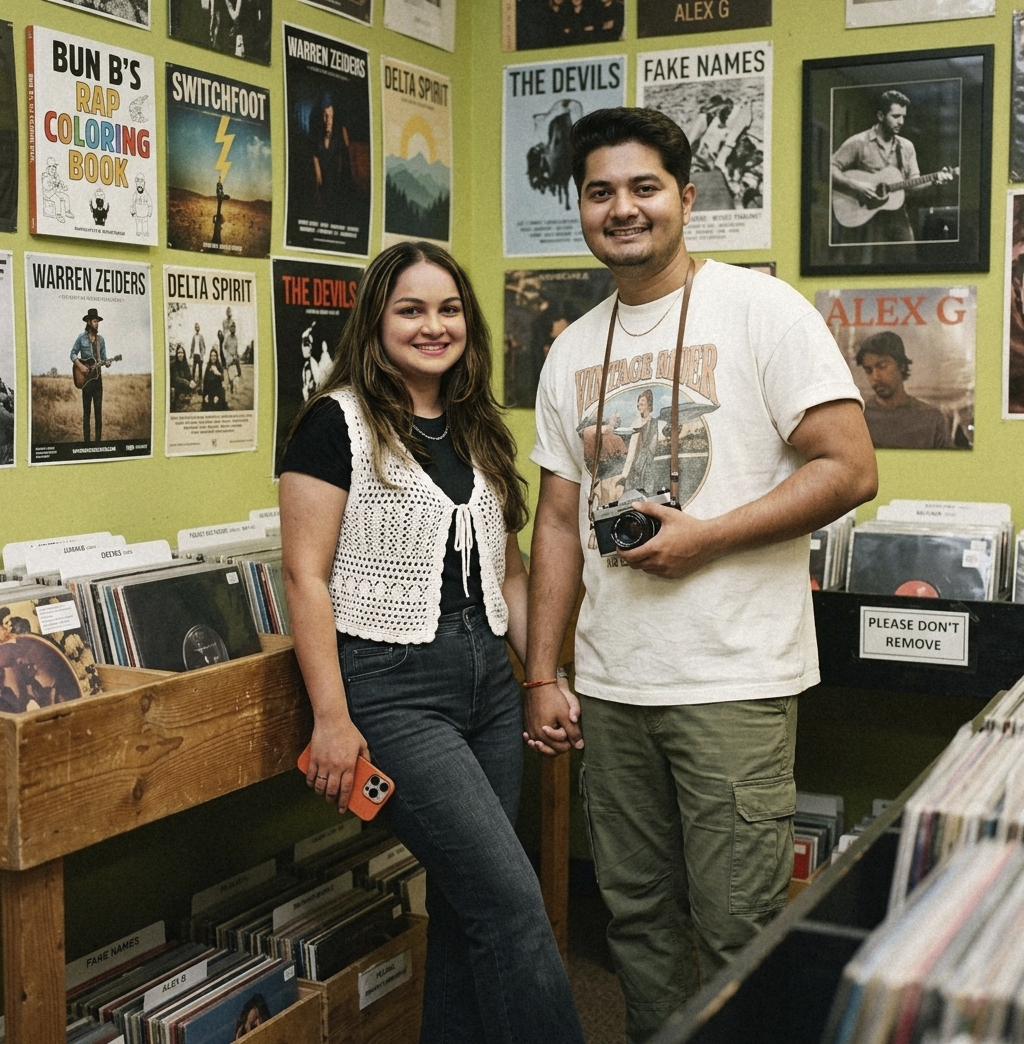 (use our photo as a couple her and keep our face 100% accurate with every face details which i uploaded, Keep Original Face From Uploaded Photo Exactly, Do Not Alter Facial Features In AnyWay, No Face Changes Even 1% ,Strictly Preserve the Face) A candid, medium shot of a young couple interacting playfully in a cozy, independent record store. The pose of the woman on the left is; her body is turned slightly towards the man, and she is leaning slightly towards him while holding his left hand with her right. Her left hand rests on her hip or holds a iphone 17 pro max orange, and her legs are crossed slightly with one bent and the other straight, leaning against a wooden record bin. She is smiling widely, she is looking at the camera with a smile. Her outfit consists of a white crocheted half sleeve vest over a black tshirt, paired with dark-wash, high-waisted flared jeans. she has Classic Long and Layered hairstyle. She has a subtle silver chain necklace. The pose of the man on the right is active and engaging; he is turned towards the woman, holding a vintage-style film camera in his right hand, pointed towards her. He is holding her right hand with his left. His legs are slightly apart, standing firmly. He has a warm smile, looking at the camera with affection. he has muscular arms. He wears an oversized, off-white t-shirt with a vintage-inspired graphic print, olive green cargo pants, and a thin chain necklace. Their faces are in sharp focus,. Their skin texture is natural, with a dewy, film-like finish. The environment is a cluttered, colorful record store aisle. The walls are a muted lime green, covered in numerous vintage and contemporary posters, including a “BUN B’S RAP COLORING BOOK” poster, a “SWITCHFOOT” poster, a “WARREN ZEIDERS” poster, and several others with specific artist names like “DELTA SPIRIT,” “THE DEVILS,” “FAKE NAMES,” and “ALEX G.” Vinyl records in their sleeves are densely packed into wooden bins that line the foreground and midground. The record bins feature small white labels, and one clearly shows a hand-drawn sign “PLEASE DON’T REMOVE.” The background behind the man features more record racks and potentially a window with posters, reflecting some of the shop’s interior. A black headphone set is visible on the rack next to him. A framed picture of a man playing guitar (possibly George Walser) is on the left wall. The lighting is warm and ambient, likely from natural light coming through a large window and interior shop lights. The overall color effect has a vintage, warm, and slightly grainy film quality (like 35mm film), with soft contrast. The backlight is minimal but creates a subtle glow around the edges of their hair and shoulders. Soft shadows fall naturally around the record bins and under the posters, and gentle highlights are visible on their skin and clothing. The camera click angle is at eye level, capturing the scene as an intimate, candid moment. Their footwear is not fully visible but appears to be casual sneakers.